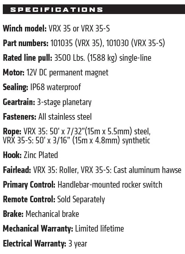 VRX 35 includes 50’ of durable 7/32” steel rope, roller fairlead, and zinc-plated hook