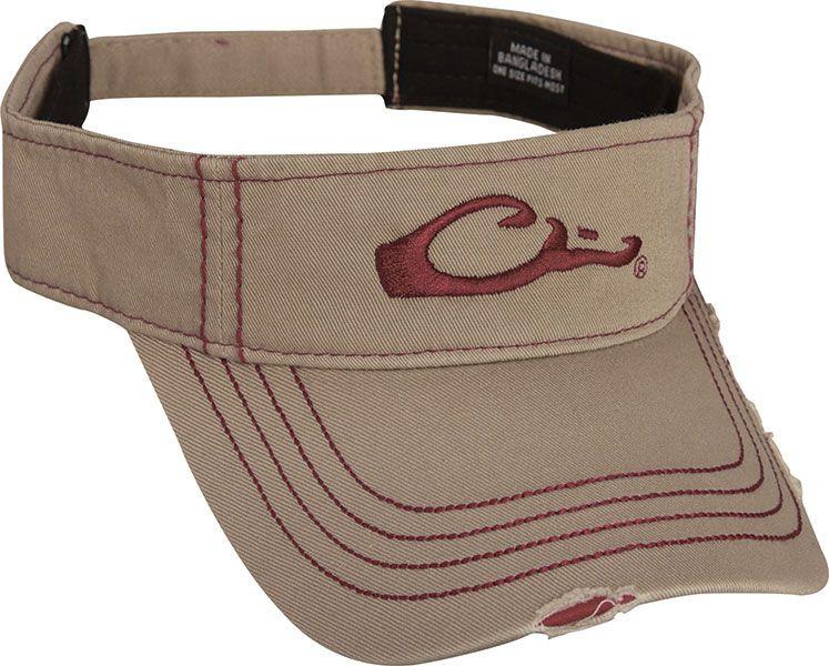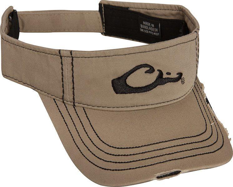 The DH Logo Visor features raised logo embroidery on the front with color-matched stitching on the bill and underneath the distressed areas. Velcro back closure and adjustment. One size fits most.