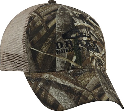Cotton camo front panels with a semi-structured mesh back. Camo under bill to reduce glare. Six-panel construction with lightly structured front panels. Velcro back closure.