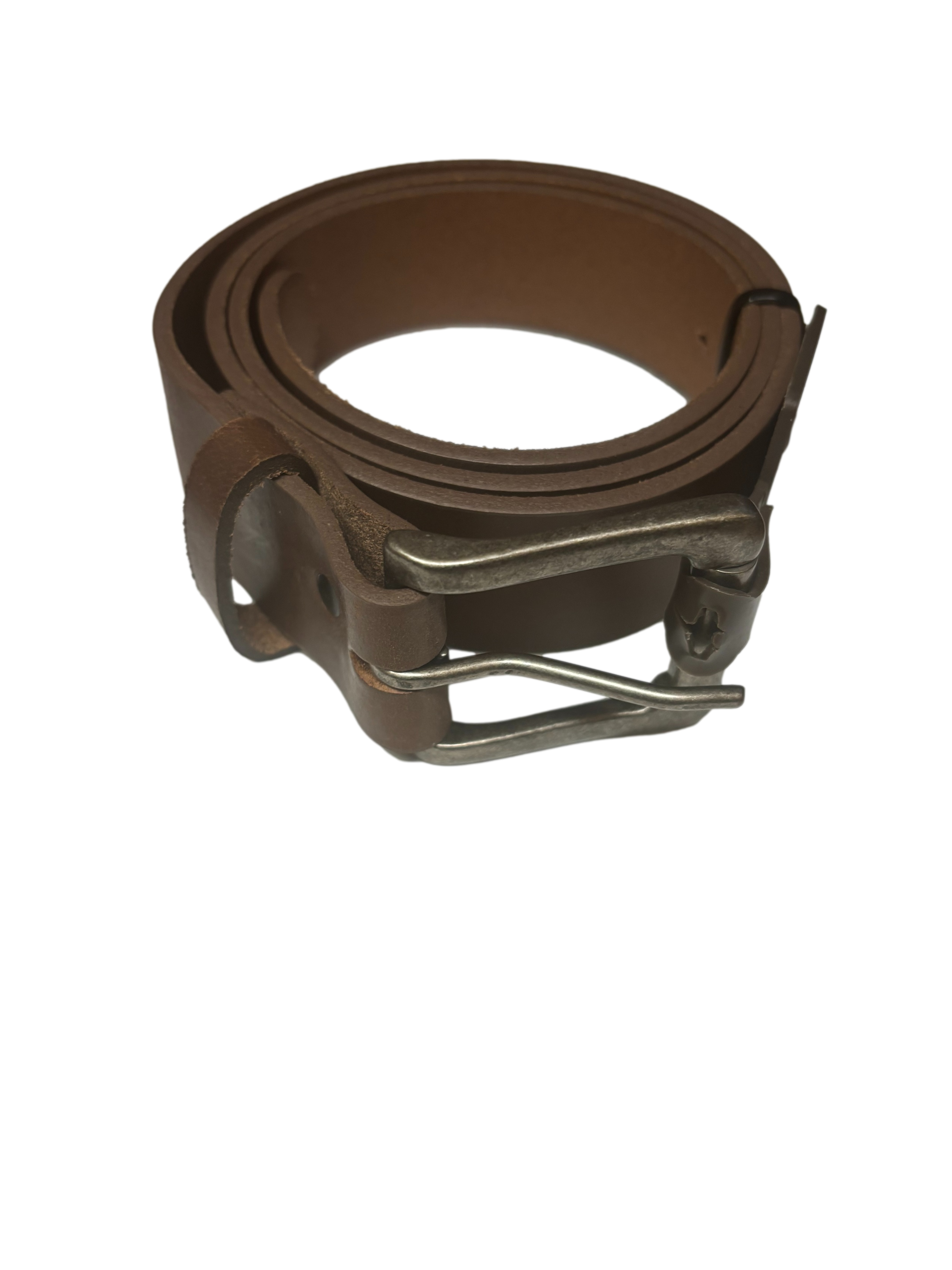 Brown oil distressed rider leather belt with antique nickel roller buckle.