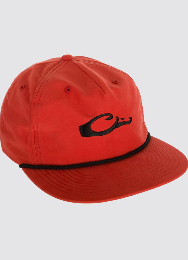 This flat bill cap by drake is the perfect hat, for summer. It’s a nice dark orange in color, with a black drake decal on the front, and has a detailed rope along the front