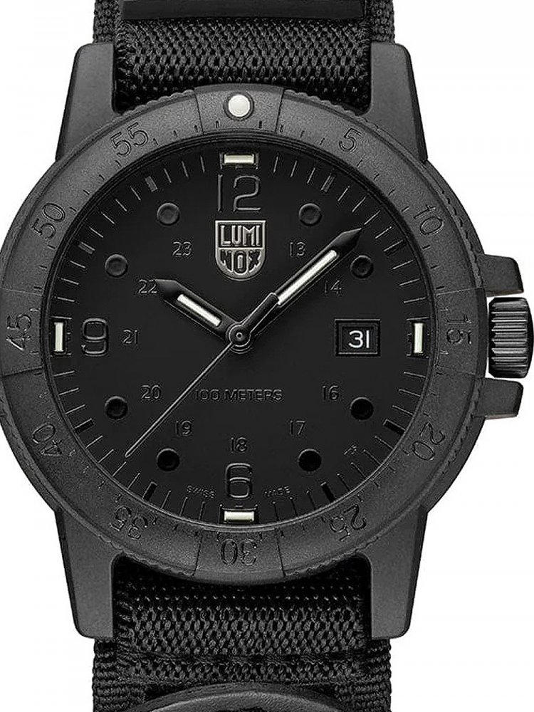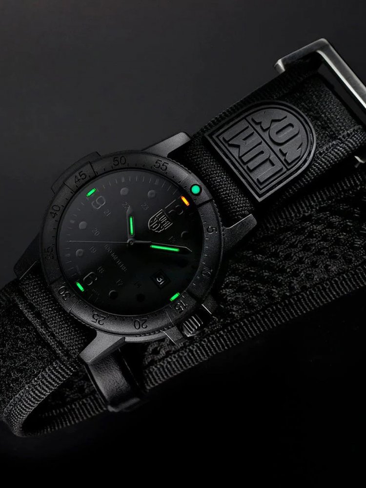 The Sea Bass with a black-out design features an impressive 44mm CARBONOX case and water resistance up to 100 meters. This black-in-black watch is equipped with a Velcro fast strap adorned with blackout Luminox shield logo. “Always Visible”, self-powered, for up to 25 years.