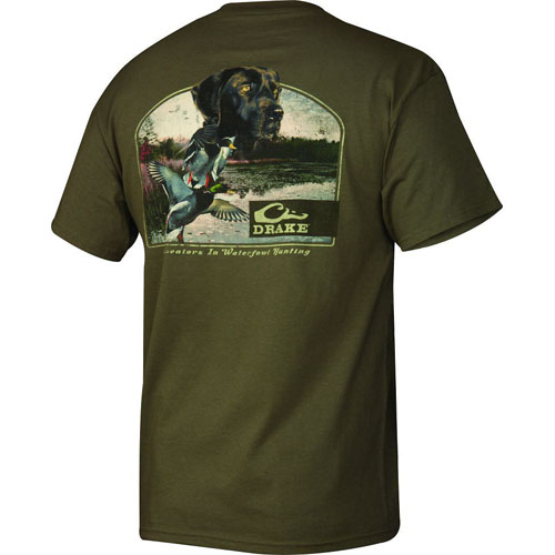 Premium ringspun cotton t-shirt featuring a full back print scene of two greenheads dropping into the marsh and a black lab eagerly watching.