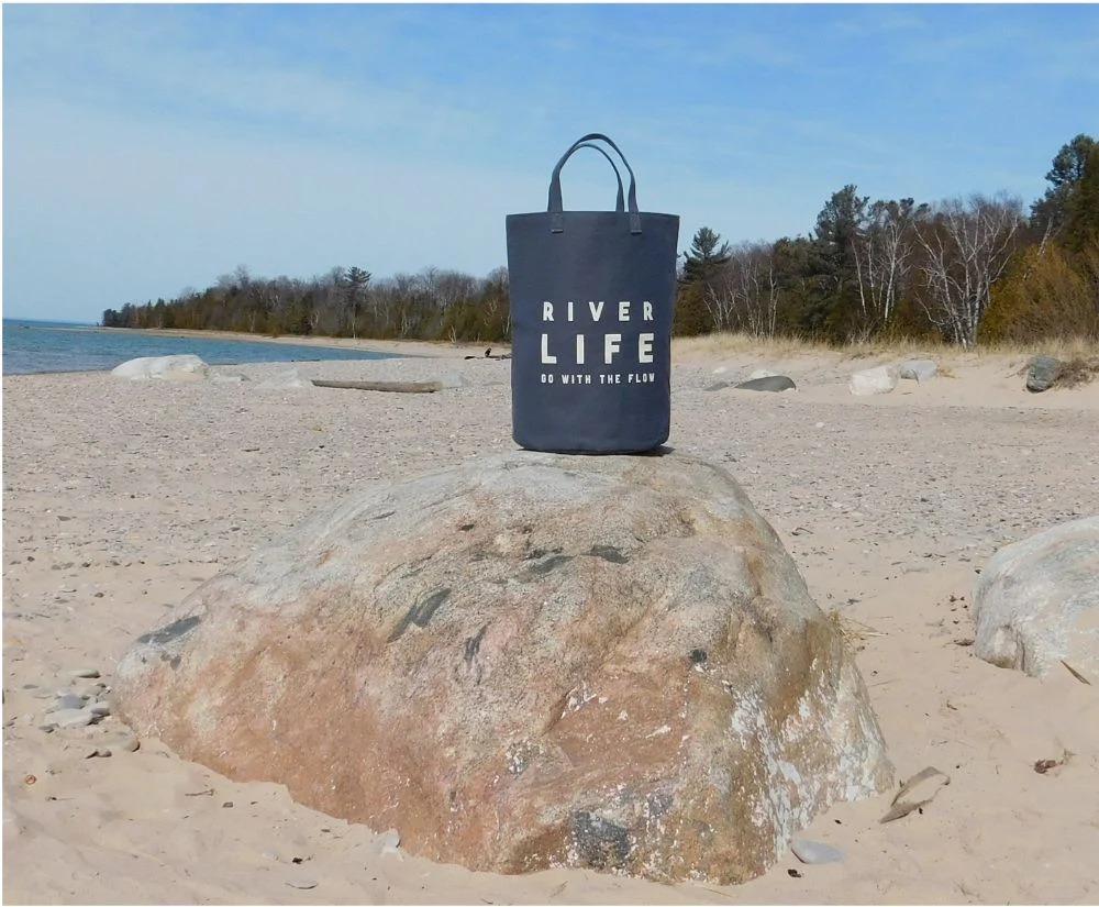Big durable cotton canvas beach bag imprinted with the words, “RIVER LIFE GO WITH THE FLOW“.