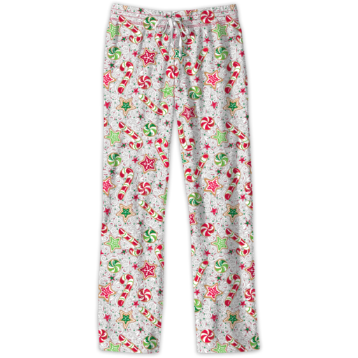 - a holiday cane cane, peppermint, and star cookie design and drawstring waistband