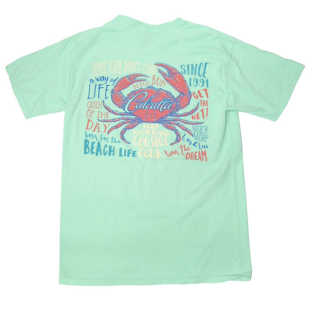 Pigment Dyed Island Reef tee with Catch of the Day logo on back and Calcutta logo on front chest. No pocket.