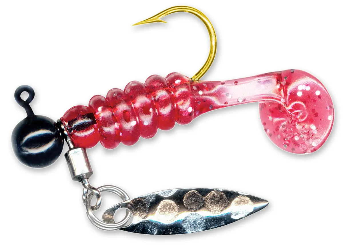 This is a small panfish lure that is 1 3/8″ long and comes in 1/16oz. Ideal for catching Crappie, Blue Gill, Rock Bass, and Perch. Also some nice Smallmouth Bass have been caught on this lure. It features a soft plastic body with a vibra-tail and a small willow blade for a little extra flash. There is one lure per pack with two spare grubs.