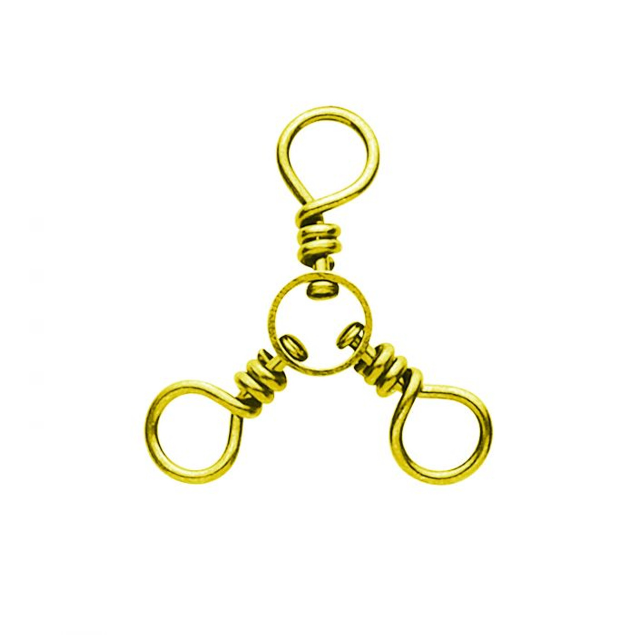 The Eagle Claw 3-Way Swivels is built with a solid brass collar and three twisted wire eyes. The 3-way Swivels come in a plastic resealable bag and feature a gold finish.