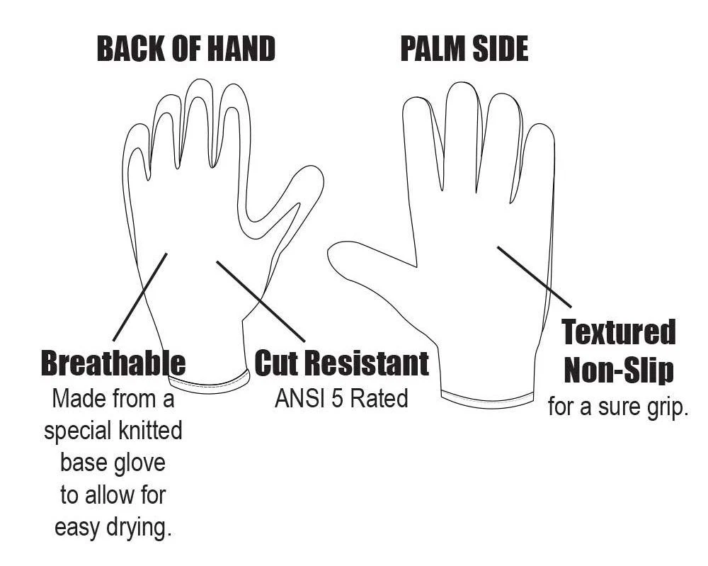 - ANSI 5 cut-resistant material protects your hands from cuts while fish cleaning.