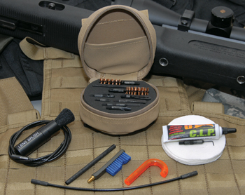 This 1/2 lb. cleaning system replaces over 3 lbs. of conventional gear. It is specifically designed to clean the AK-47, M1, M14, M24, M240, M40, and all 7.62MM variants. With the flexible cleaning rods it is only possible to clean correctly, from Breech-to-Muzzle®. The chamber, shoulder and neck can easily be cleaned. Bore obstructions, mud or snow, can be dislodged out the muzzle end. A stuck empty case or bullet lodged in the neck can be easily knocked out. Specific tools are included to clean the locking lugs, bolt face, carrier key, bolt and slide. All parts are blackened to eliminate glare. Fast and accurate cleaning can be accomplished in minutes.