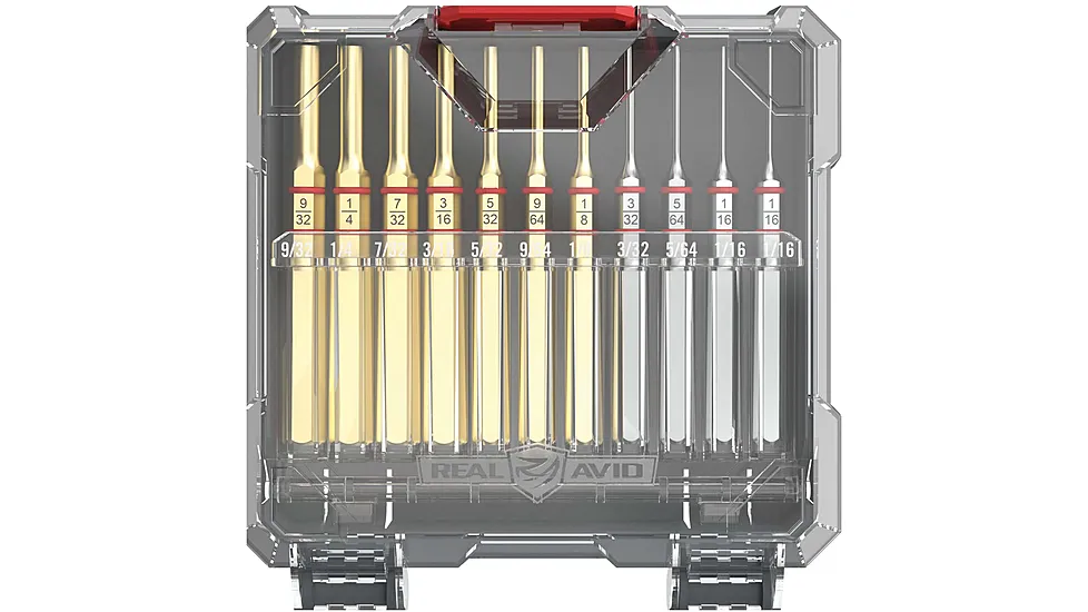 Gunsmithing punches are core tools needed to modify or disassemble firearms. The Real Avid Accu-Punch 11-Piece Standard Pin Punch Set is designed from the ground up to work better with firearms. The punches are made of brass and hardened steel with a nickel plating to resist corrosion. The hex-shaped handle and rubber O-rings provide precise control during use.
