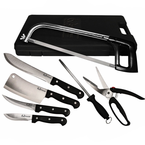 All the pieces in this game processing knife set feature a durable stainless steel blade and riveted handle.