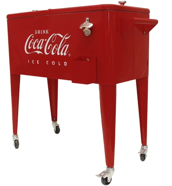 Get the party rolling with this retro metal cooler! This officially licensed Coca-Cola® cooler is a decorative solution for storing the drinks you plan to serve for your festivities. And the removable double lid allows you to fill the insulated poly liner with ice and beverages. Additionally, the interior compartment of this 80 qt. cooler has ample volume, so you can keep up with your thirsty guests. Featuring a design inspired by the iconic Coca-Cola logo, this whimsical icebox is a union of classic charm and modern-day function. If you are serving brews in old-fashioned bottles, it comes with a built-in bottle opener and cap catcher. For an added touch of convenience, the steel bar offers a place for you to hang a towel. This retro cooler has four casters for easy transport, and two of them can lock so the cooler stays in place when unattended. You can easily drain the melted ice after the party’s over by pulling out the included plug.