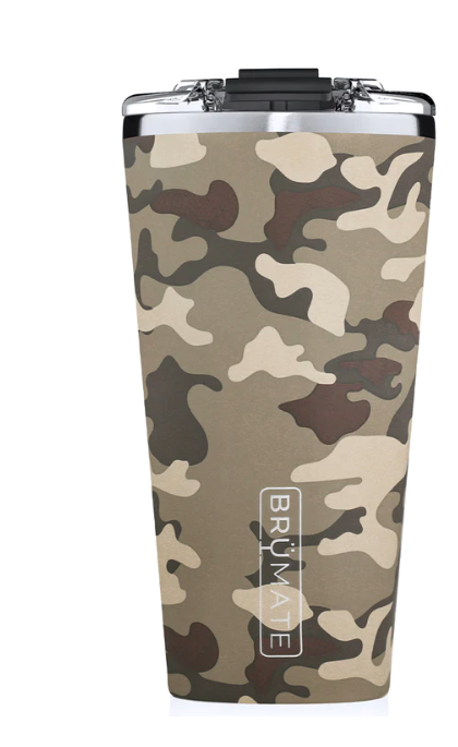 The BruMate Imperial pint green camo cup fits 20oz. of your favorite drink will keep it at the perfect temperature. It also a bevlock technology fully leakproof locking lid.