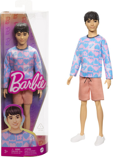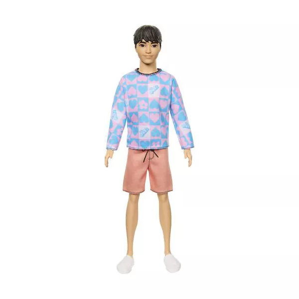 • Ken fashion doll wears a colorful patterned shirt with trendy hearts, flowers and Ken logo, paired with peach shorts.