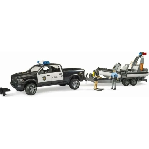 The police are investigating a case on the water! The powerful 4×4 pickup truck is modelled after a Dodge RAM 2500. The all-terrain vehicle features cool lights and sounds, authentic tyre treads and a steering wheel extension for the front axle. All four doors and the tailgate can be opened on the truck. Manoeuvre the police boat down to the water using the handy trailer. The boat can actually float!