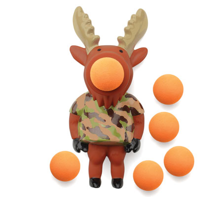 Grab that Moose by the mid-section and give him a squeeze! That sudden air pressure launches a soft foam ball up to 20 feet. The harder you squeeze, the faster and further the ball shoots out. Includes six soft foam balls. Works with all Power Popper refills.
