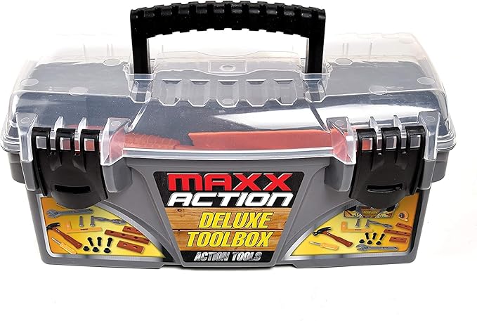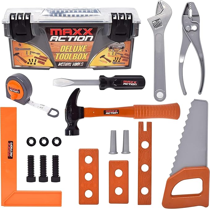 Give your little one everything they need to build and make pretend home improvements with the Maxx action toolbox. This set includes 18 pieces including a working measuring tape, hammer, screwdriver, kid safe saw, wrench, pliers, and more! When the job is done, the tools fit easily in the durable toolbox.