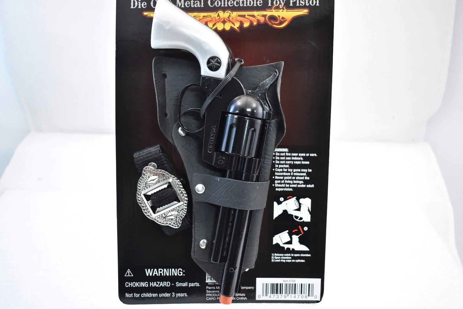 This Outlaw Pistol and holster set looks like a real old west revolver! The die-cast metal gives it the feel and weight of a real pistol and is a great toy for kids. The dark-colored metal with white pistol grip is the perfect toy fun for someone who is battling the dark side. The good guy or the bad guy can use this gun.