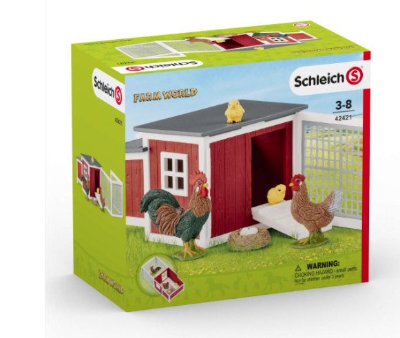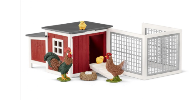 Right at the crack of dawn, the cockerel hops up onto the roof of the chicken coop and crows. As the first rays of sunlight appear, the hen comes out too. She starts to scrape at the ground and peck for seeds, when cheeping noises can be heard from the coop. The roof is folded open to reveal the wonderful secret hidden inside: chicks have hatched from the eggs!