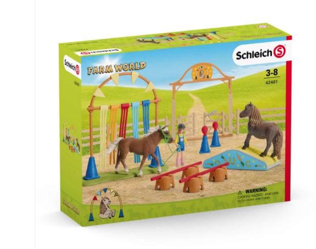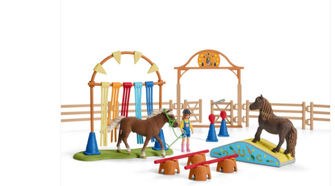 During agility training, the ponies playfully familiarise themselves with a variety of obstacles. First, they are allowed to sniff them up and down. Then, the ponies are carefully led over, through and around them. For some obstacles, the ponies need to muster up a lot of courage. At such times it is important to be patient and lovingly encourage them. Includes: 1x Classic pony, 1x Shetland pony, 1x girl, 1x riding helmet, 1x bridle, 1x lead rope, 1x entrance gate, 8x paddocks, 1x seesaw, 4x cone, 4x tree trunk obstacles, 2x pole, 2x balloon, 1x base plate, 1x archway, 4x pennant, 1x crossbar, 5x flutter curtain, 1x sticker sheet