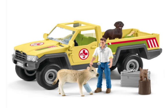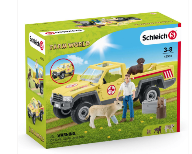 Expansion set for the veterinary practice with pets from the Schleich Farm World. A calf on the farm has sprained its foot. The vet jumps in his pickup straight away with his Labrador and the cat, and heads off to examine the calf. The vet’s case with medication and bandages is always in the loading bay of his pickup. He bandages the calf right away and drives it to the veterinary practice. After the X-ray it can recuperate there before being taken back to the farm. Includes: 1x pick-up, 1x vet, 1x calf, 1x Labrador Retriever, 1x kitten, 1x aluminum box, 1x stethoscope, 1x bandage, 1x bowl, 1x bone, 1x tree trunk, 1x sticker sheet.