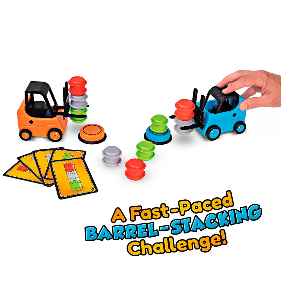 Start the round by drawing a card. Your goal is to stack the barrels to match the challenge card and then place that stack on your platform first using ONLY one of the two toy forklifts. Can you win the most cards AND keep your warehouse accident-free? Classic vehicle play becomes a thrilling stack-and-match challenge with Forklift Frenzy – no forklift license required!