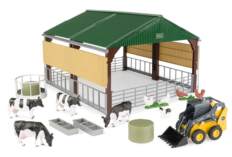 A wonderful set to get the smallest farmer started on their own farm. This set includes our livestock building, two horses, three cows, round bale feeder and two round bales. A John Deere skidloader rounds out this set. Ages 3 Yr.+