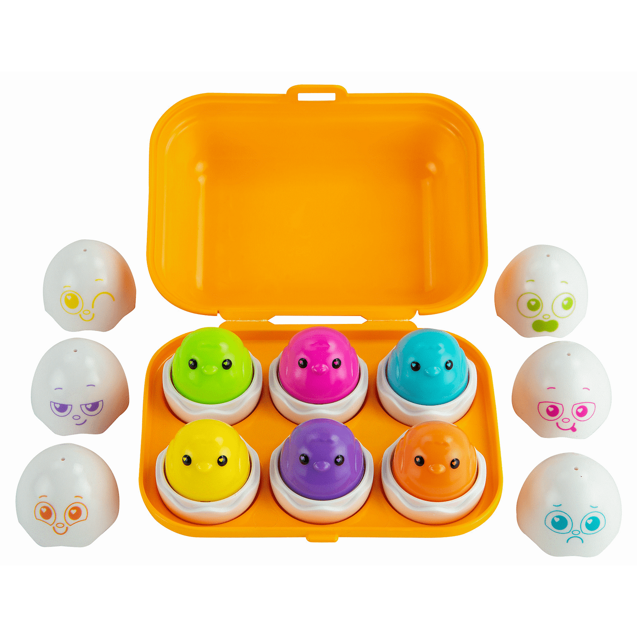 Encourage creative play with the brightly colored Lamaze Sort & Squeak Eggs. Removing the top shell reveals a little chirper inside. Pressing down on the chick rewards baby with a fun chirping sound. Learn colors by matching the correct face color on the top shell to the chick. Each face features a different expression which allows you to teach your baby about happy, sad, silly and more. Your child can also learn shapes by matching the correct shape on the bottom shell to the correct spot inside the egg crate. The egg crate keeps everything together and makes this a fun toy to take along while traveling.