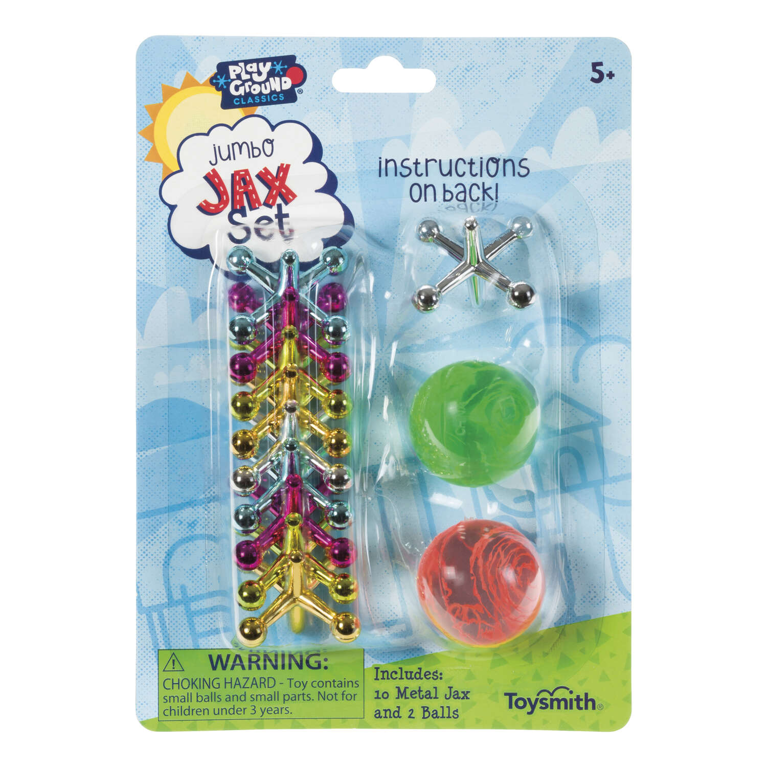 A classic jacks set, the Metal Jax Set from Playground Classics 174, includes 10 metal jacks and 1 two-toned, brightly colored hi-bounce ball. Works great with the jacks or as a stand-alone bouncy toy. Lightweight and traditionally designed, each 1-inch jack is made of quality, lightweight metal that is silver in color. Suitable for indoor or outdoor play on any flat surface, all game pieces come in an outdoor-themed peggable blister packet with instructions on the back.