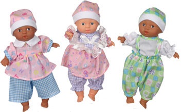A 6.5 inch soft-bodied doll with vinyl head, arm and legs. Comes in 3 different skin tones. Made by Toysmith. The purchase is for one baby only.