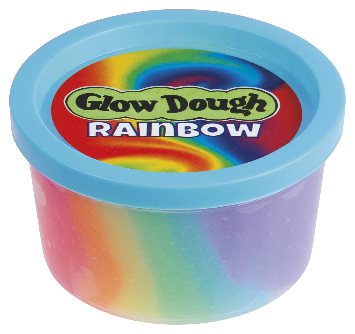 With different colors in each container, and the ability to glow in the dark, Toysmith Rainbow Glow Dough is a bestseller. A reusable plastic container holds 4 ounces of multicolored putty. Comes in 3 different rainbow-style color combinations. Pick the classic rainbow option with hot pink, orange, yellow, green, blue, and purple; the cooler mix with green, blue, and purple; or the warm color mix with hot pink, light pink, light yellow, and dark and light orange.