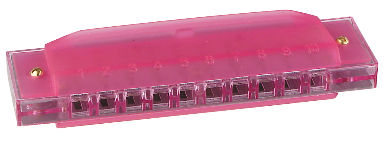 This 4 inches long translucent harmonica comes in a plastic storage case for traveling. Assorted colors. 3yrs and up