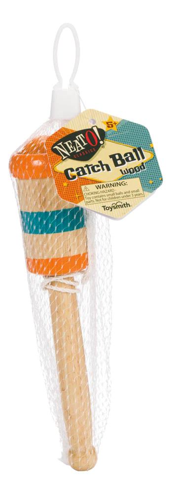 A modern version of a retro toy, this popular wooden catch ball game from Neato! is ready to play. Beautifully designed with a shiny orange wooden ball tethered to the base of the blue-and-orange striped wooden cup by a cotton string. Measures 7.5 inches long. The handle is round with a bulbous end for easy gripping. Crafted with sturdy, high-quality wood for a classic look and long-lasting play. Great for hand-eye coordination as well as reflex, agility, and balance. No assembly required. Each Wooden Catch Ball toy comes in a net bag.