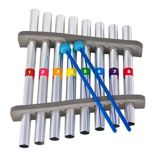 The Woodstock Chimalong is a unique children’s instrument offering a pure sound and creative music instruction system. Tuned to C Major, the Chimalong can be played by number, color or notes. A xylophone-style instrument made with world famous Woodstock Chimes tubes, the Chimalong comes with an extra #7 tube, which changes the B (for key of C) to B flat (for key of F), giving greater musical flexibility. Also comes with two mallets & color-coded songbook.