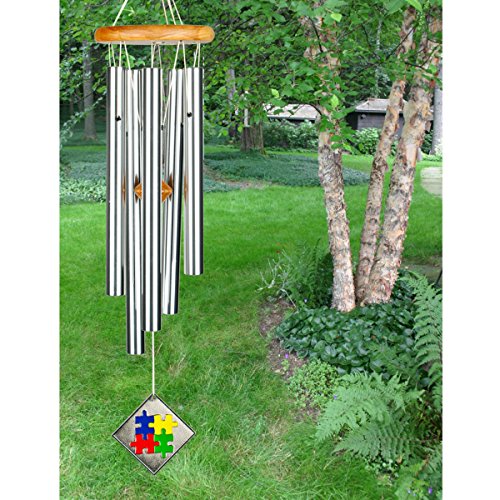Support autism treatment and research when you buy the Woodstock 25 in. Chimes for Autism. Music therapists choose Mozart’s music when working with autistic patients, and this chime is tuned to the opening notes of Mozart’s Piano Concerto No. 21 with a happy and calming song. It’s made with an ash wood hanger featuring a rich cherry finish. The five silver aluminum tubes are a handsome accent to the nickel-plated faux cloisonné windcatcher.