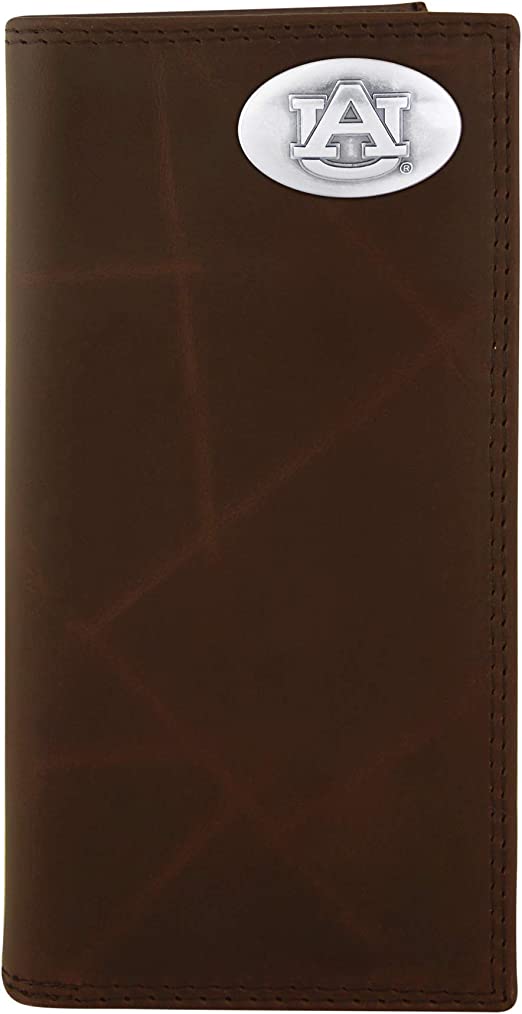 Carry your Auburn Tigers school and team spirit with you at all times. This brown genuine smooth wrinkle leather secretary-style roper wallet is decorated with a silver gun metal concho and features bill and checkbook compartments, an ID window, six card slots, photo sleeve insert and spare key holder. Attractive bagging to make the perfect gift for the ultimate Auburn fan.