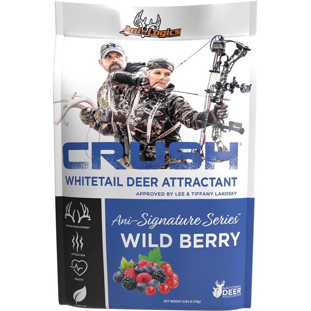 Use the temptation of sweet ripe berries to draw in and nourish whitetails from miles around. Ani-Logics CRUSH Ani-Signature Series Wild Berry Granular Deer Supplement and Attractant combines wild berries with a proprietary grain-based formula to create a true deer magnet wherever you pour it. Loaded with minerals, essential oils, and probiotics, this supplement also supports optimized whitetail health. The CRUSH lineup leans on the field experience, herd management, nutrition, and scientific knowledge of the Ani-Logics team in partnership with Lee and Tiffany Lakosky of The CRUSH. Simply pour CRUSH Ani-Signature Series Wild Berry attractant directly on the ground in strips or a pile. You can also use it in a feeder alone or added to grain. 5-lb. bag.