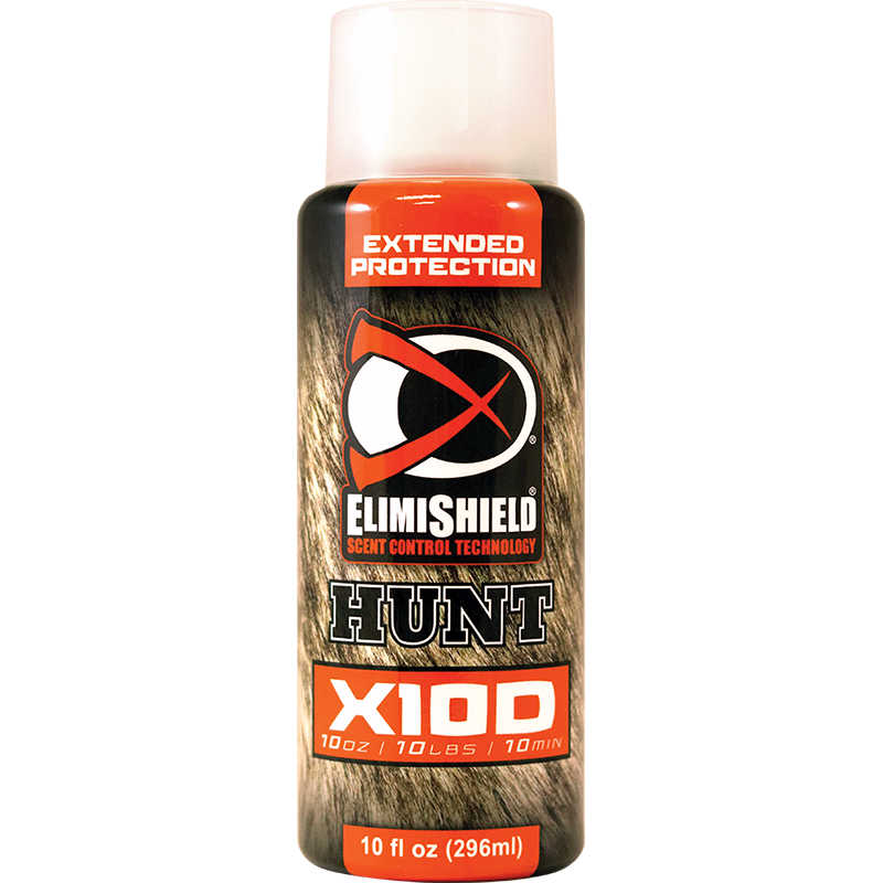 ElimiShield HUNT X10D is a semi-permanent treatment for textiles that prevents the formation of human body odors. When used as directed, X10D bonds to the fibers in textiles to create a chain of atoms that produces an uninhabitable surface for odor-causing compounds. The “shield” is semi-permanent and lasts for up to 50 washings. It also protects garments from souring during storage.