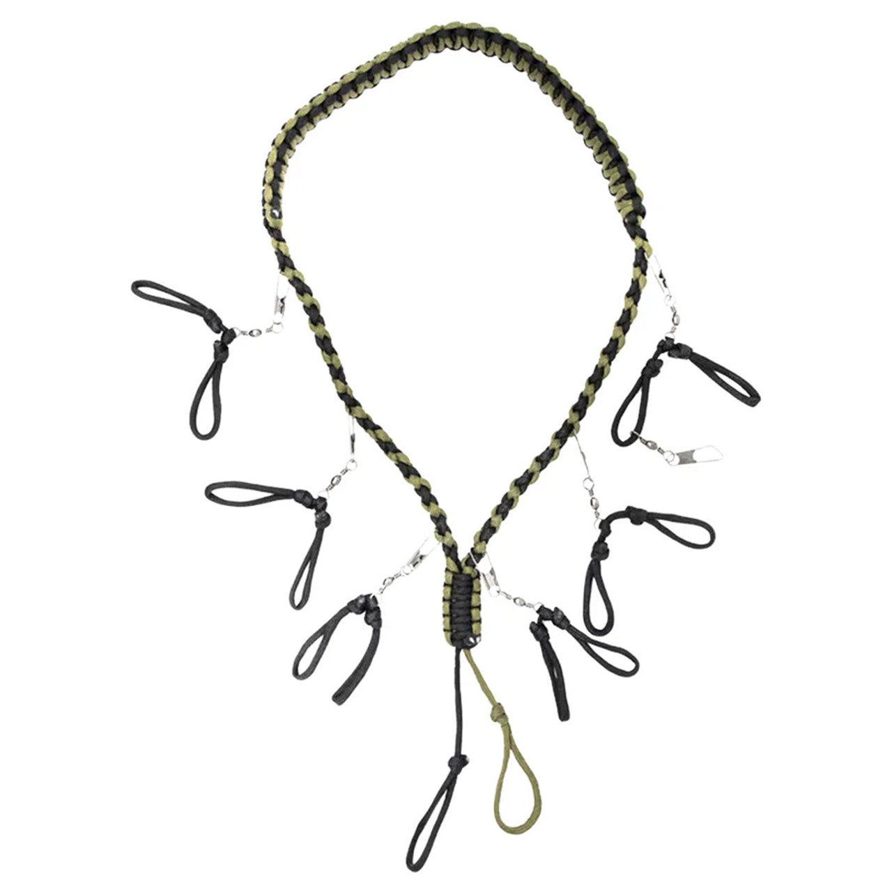 Enhance your waterfowl hunting experience with the Power Calls 7-in-1 Call Lanyard. This hand crafted lanyard boasts seven double loop drops, enabling you to securely attach up to seven calls or whistles. Thanks to its adjustable design with seven heavy-duty black swivel snaps, you can tailor your setup for any hunting scenario. The lanyard is constructed from top-quality 550 paracord for durability and features a widened neck strap for all-day comfort. keep your calls within easy reach and hunt with confidence using the Power Calls 7-in-1 Call Lanyard.