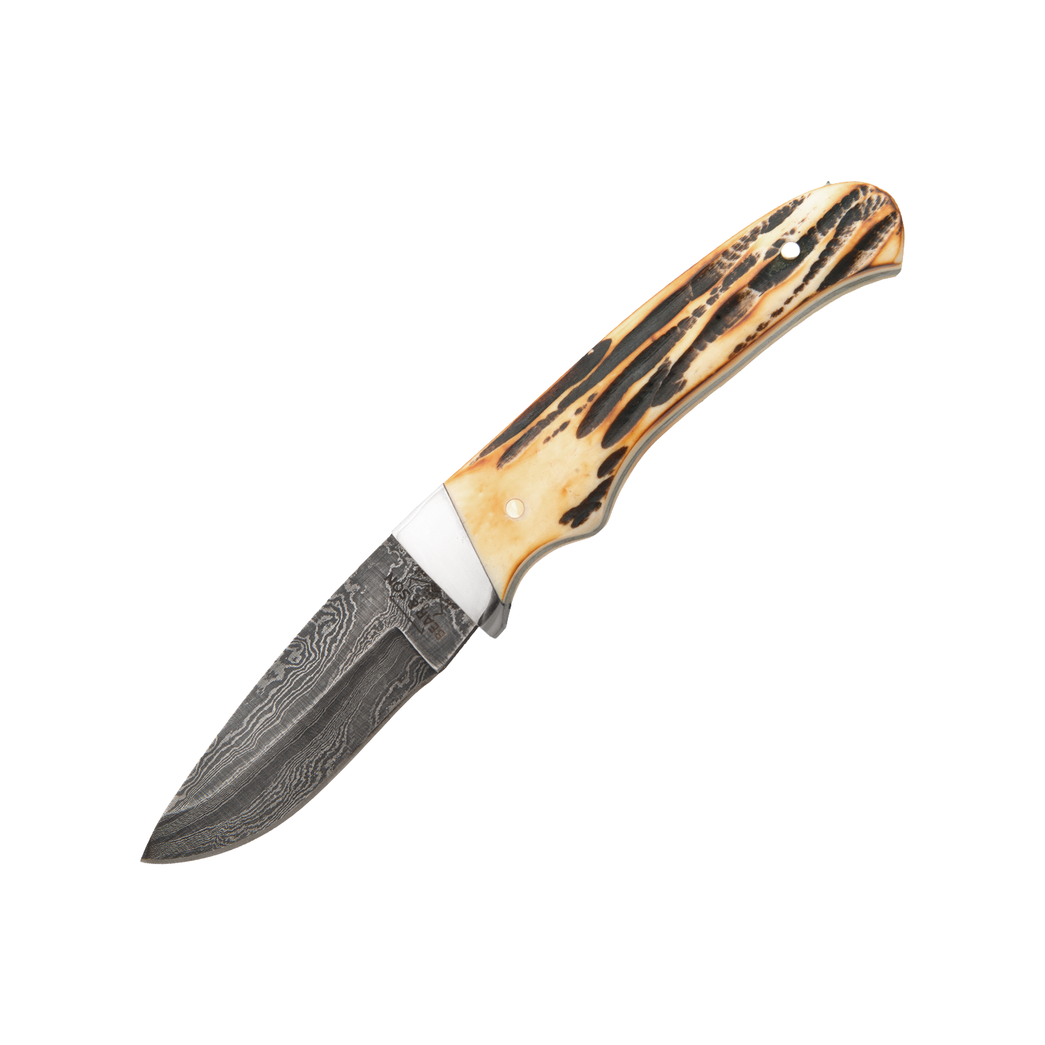 Model 548D is a 4.1 ounce Drop Point designed with a Hollow Ground 2-7/8” 416 Layer Damascus Steel blade that is easy to sharpen, and holds an edge very well. The handle is Genuine India Stag Bone™ material with a nickel silver bolster. This fixed blade is a great for everyday carry or medium to small game. This knife also features a brown leather sheath for belt carry. Proudly made in the USA.