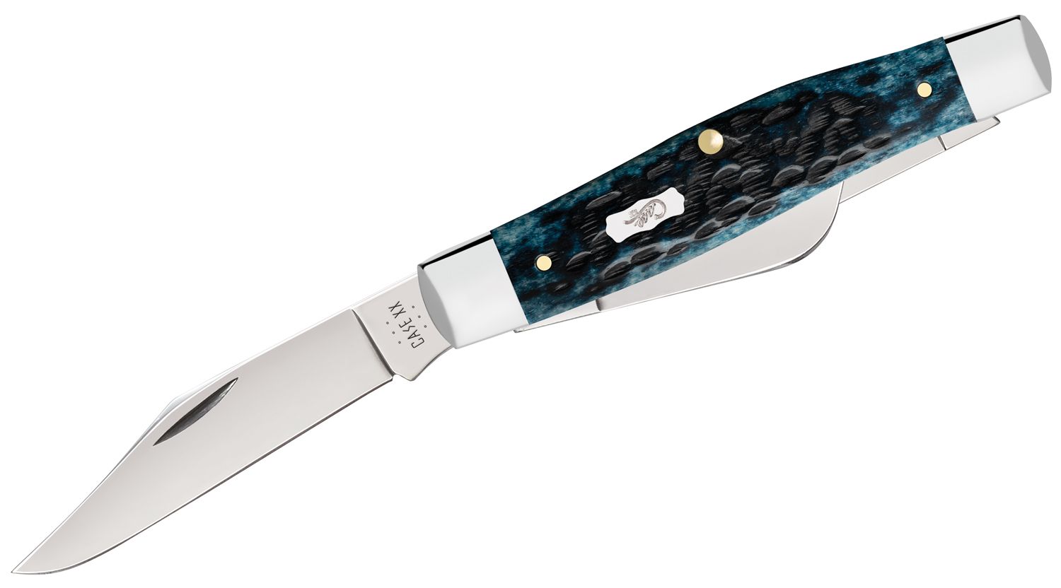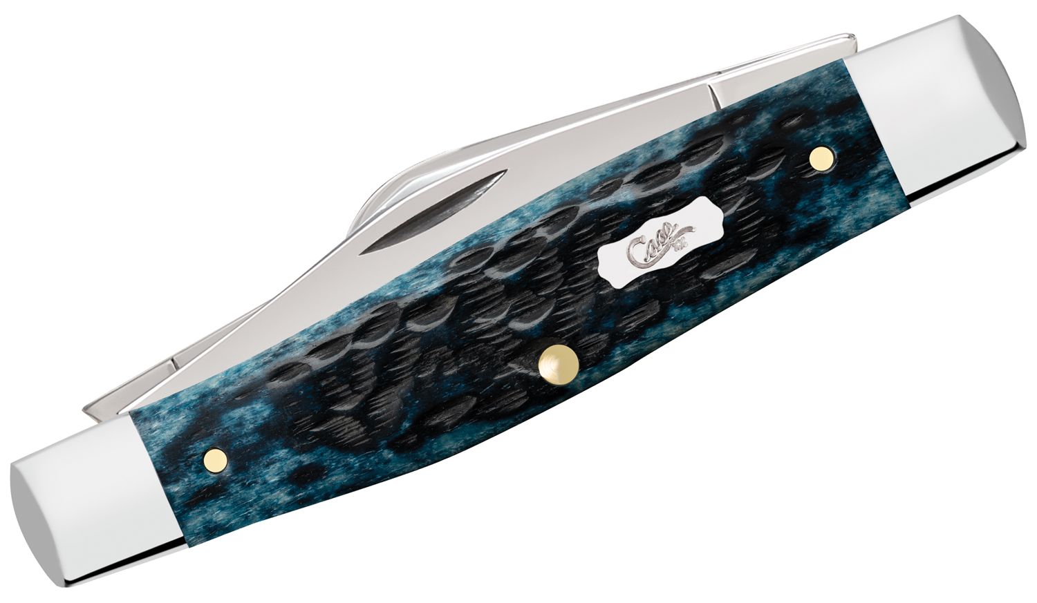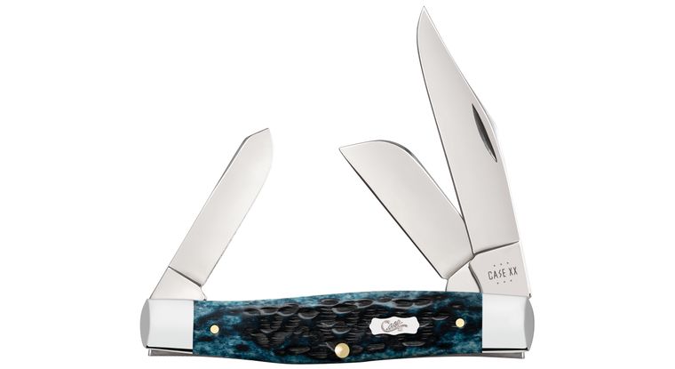 This family showcases the stunning way natural bone soaks up Case’s rich blue color. Paired with the case emblem and iconic Pocket Worn finish, this family boasts a simplistic beauty that can withstand the rigors of your everyday carry. This Large Stockman is a traditional three-bladed multi-purpose pocket knife. The Clip and Sheepfoot blade sit on the pocket end while the Spey blade sits on the cap end. The Clip blade is commonly used as a multi-purpose blade and is preferred for detail work. The Sheepfoot blade allows for added strength at the point making it great for carving and achieving a clean cut. The Spey blade is commonly used as an all-purpose utility blade. These blades are constructed with Case Tru-Sharp stainless steel which is a special high-carbon steel that helps the blades hold an edge longer than conventional steel. It also offers extraordinary blade strength and corrosion resistance.