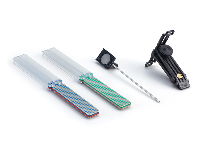 Multi-use on blades, kitchen knives, specialty and garden tools, etc. Kits available in Extra-Extra Fine provides the finest polished edge of all bonded diamond abrasives. Extra-Fine diamond to polish and refine a razor edge after sharpening with a coarser diamond. Fine diamond for a razor sharp edge. Coarse diamond to quickly restore a neglected edge. Folding plastic handles protect sharpener when not in use. Both novice and professional will appreciate the ABG to create precise, professional, consistent sharpening results, Accommodates different spine widths as well as standard blade thicknesses.