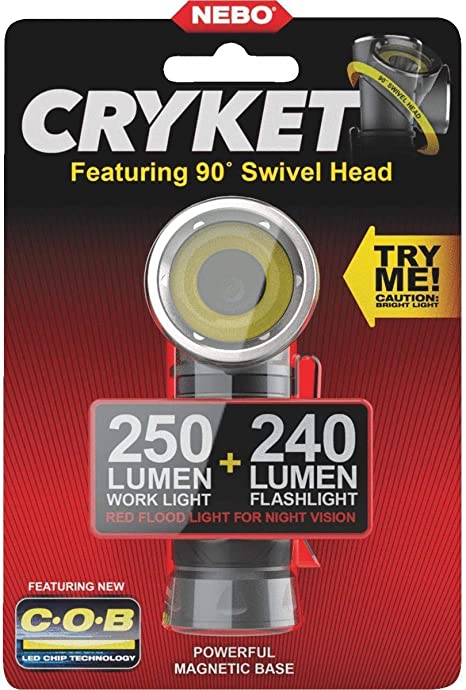 Versatile 3-in-1 COB (chips on board) LED (light emitting diode) work light, spot light, and intense red light. Swivel design features a 90-degree swivel head with 9 positions to place light wherever it is needed. Magnetic base and steel clip provide convenient hands free operation. Fully dimmable, water and impact resistant, direct-to-red feature, and rubberized non-slip grip. Light modes: 250-lumen spot light with 3.5-Hour run time, 24-lumen flood light with 2.75-Hour run time, and 15-lumen red light with 6.5-Hour run time. Requires (4) AAA batteries.