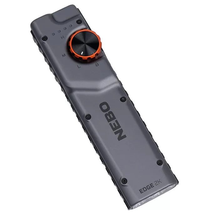 NEBO Edge 2K is an ultra-slim EDC pocket light with a pushbutton tail switch plus rotary dial. Use the tail switch for on or off and twist the dial to adjust the brightness level or for lockout. The Edge 2K has battery status indicators and a USB-C port for fast charging.