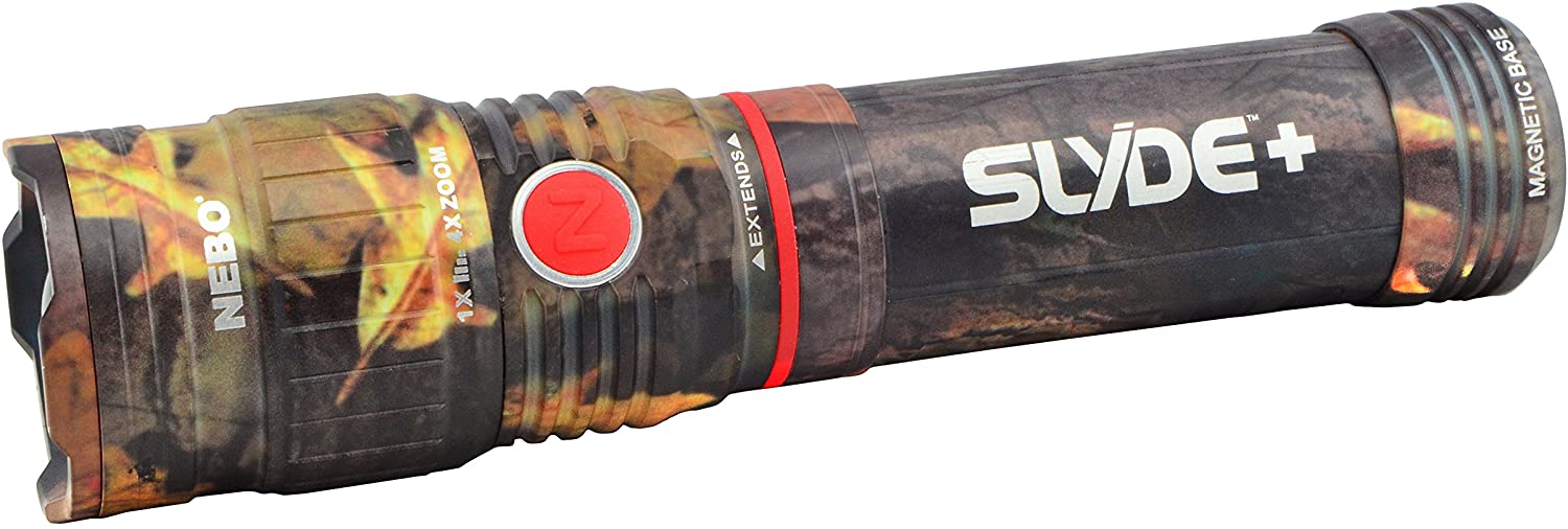 The Nebo Slyde + Camo Flashlight is better than ever! The new SLYDE + is now equipped with programmable memory settings for each light mode, a new C•O•B red light function, a 4x adjustable zoom and instant slide on. And best of all? With all these new great features, the new SLYDE+ is still the same price!