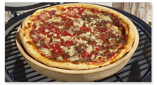 The Big Green Egg Deep Dish Pizza/Baking Stone enables you to bake a variety of recipes … from pizza, quiche and lasagna to pies, cinnamon rolls and desserts. Our stones distribute heat for even baking and browning, and the stones retain heat so efficiently that your foods conveniently remain warm longer.