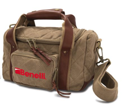 Designed to make transporting shells around a sporting course or to the field a breeze, the Shooting Bag from Benelli’s Lodge Collection comfortably holds four boxes of shells and is equipped with both carry handles and a shoulder strap. Constructed of handsome diamond-stiched waxed cotton with leather accents and a durable 210 lined interior, it also features a zippered front pocket with elastic loops for convenient storage of choke tubes. Measures: 7″ x 12″ x 8″ and fits four standard boxes of 25 shells (up to 12ga).Olive Waxed Cotton