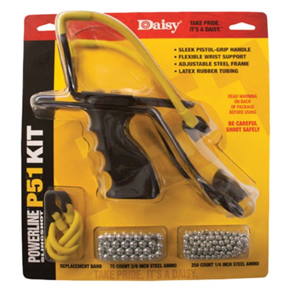 The Daisy Model P51 Slingshot Kit features their most-advanced slingshot along with 75 each of two sizes of steel ammo (3/8-inch and 1/4-inch) plus an extra replacement band. Everything you need for a full day of slingshotting.