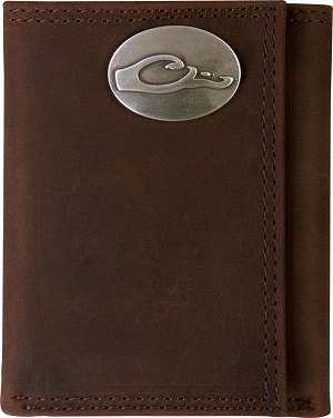 Brown leather tri-fold wallet with the Drake Logo metal oval on the outside.